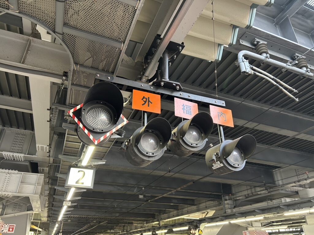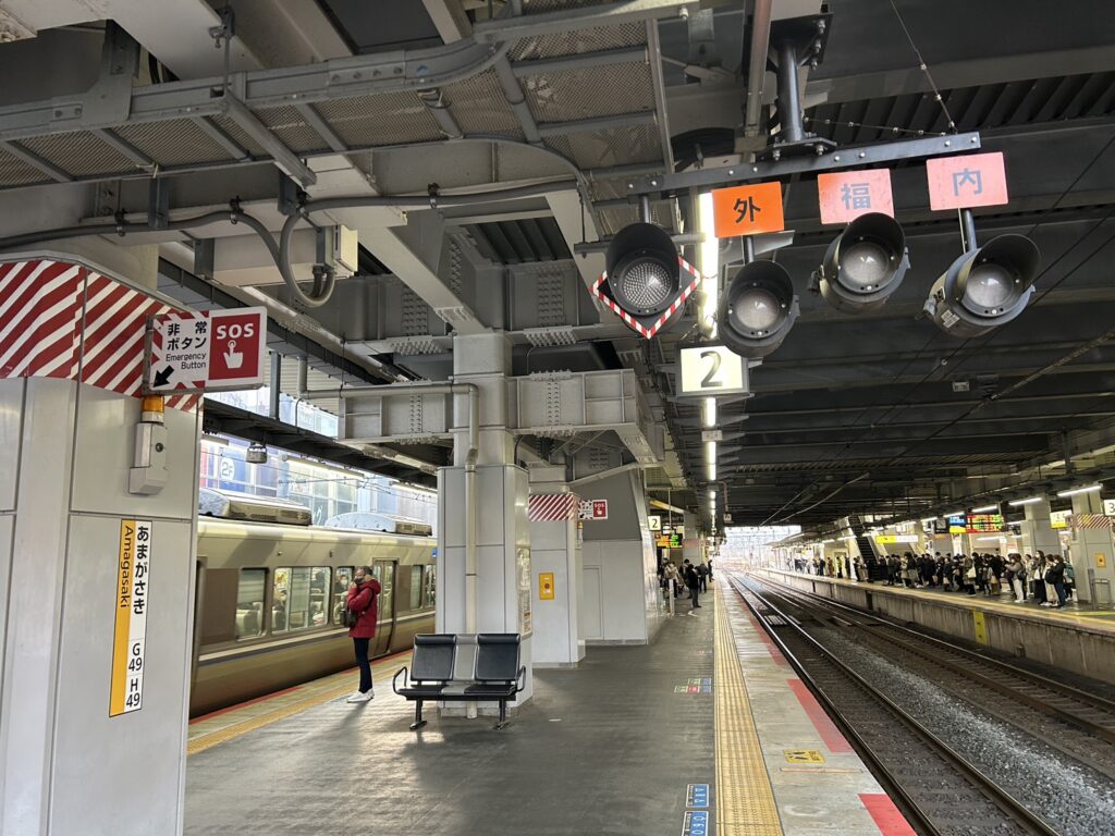 JR尼崎駅の2番線、3番線ホームの一角に、「外」「福」「内」と書かれた看板が備わるランプがあります。これは出発反応標識と呼ばれるもので、車掌や駅員に出発の合図を送るためのものだそうです。それぞれの看板は4本の線路がある東海道線(神戸線)の外側線(外)内側線(内)、そして福知山線(福)を意味しています。